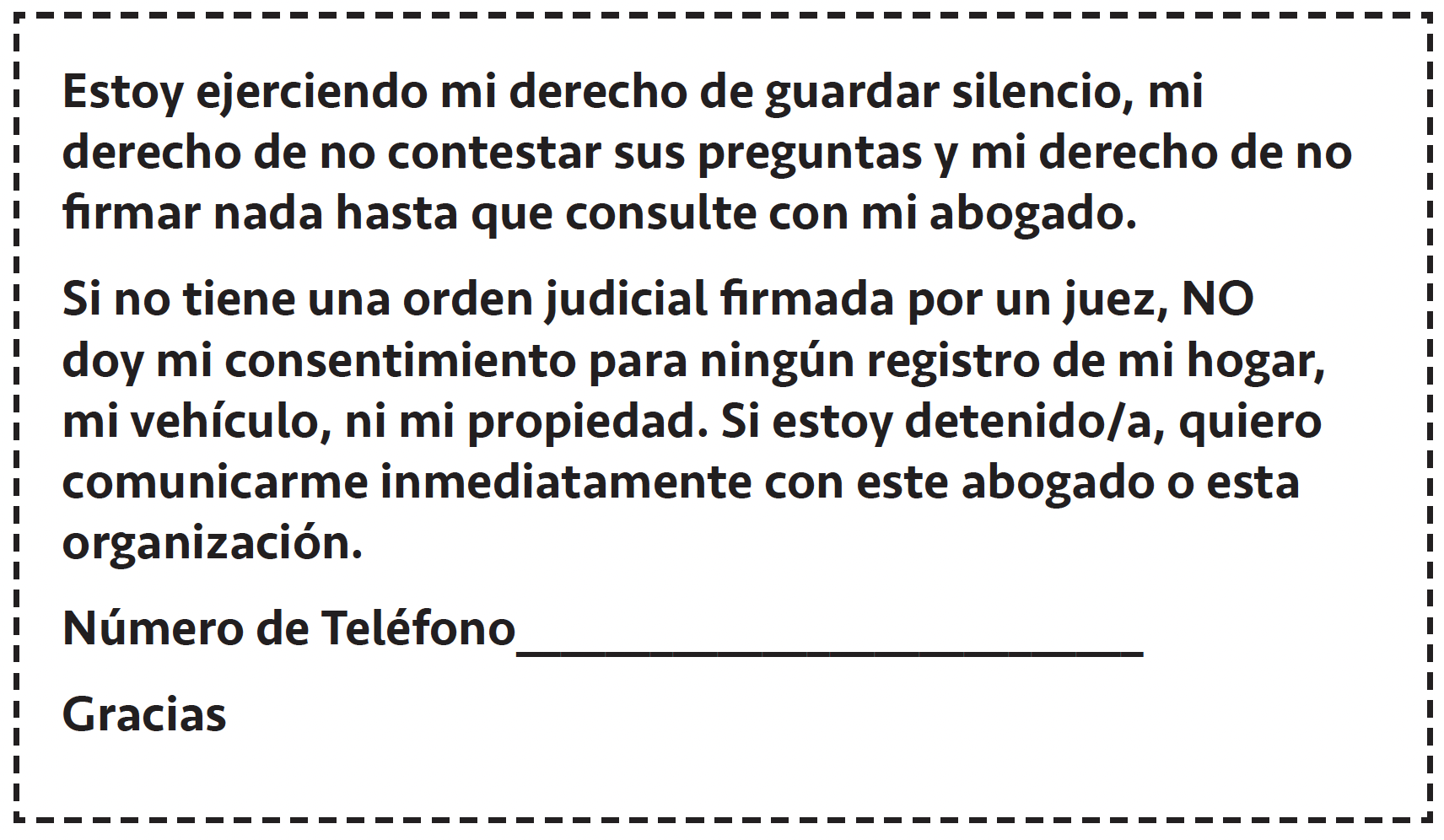• Remain silent. Present the Rights Card at the end of this booklet to officers. If you talk about your immigration status, your country of origin or how you got to the U.S., this information could be used against you.